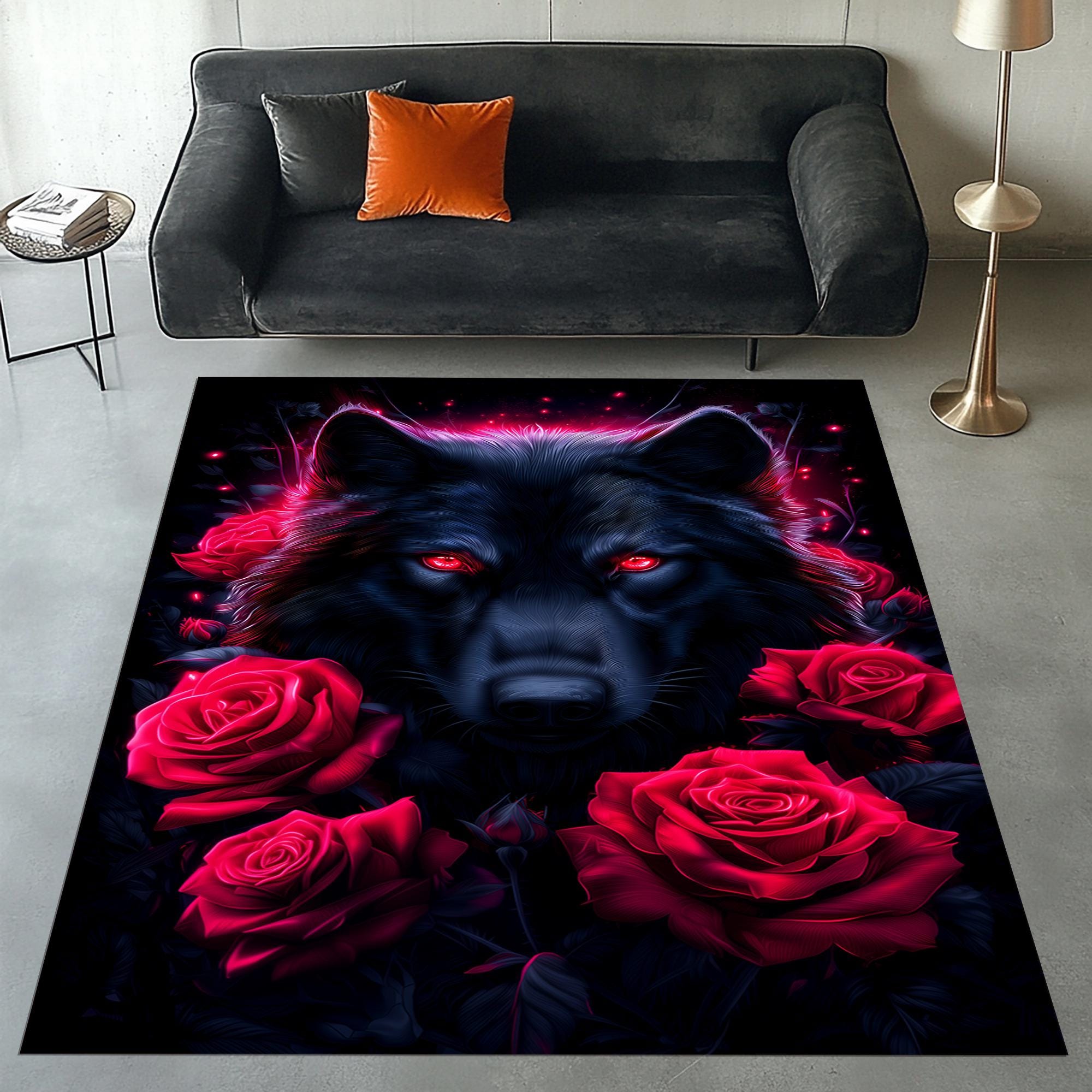 Red Floral Wolf Rug, Wolf Area Rug, Wolf Pattern Rug, Red Eyed Wolf Rug, Wolf Rug, Wolf Themed Rug, ...