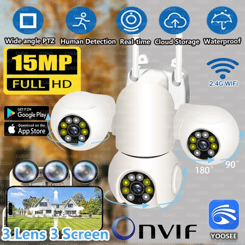 15MP 8K Wifi IP Camera Three Screen Three Lens Outdoor Waterproof Camera Onvif PTZ Auto Tracking CCT...