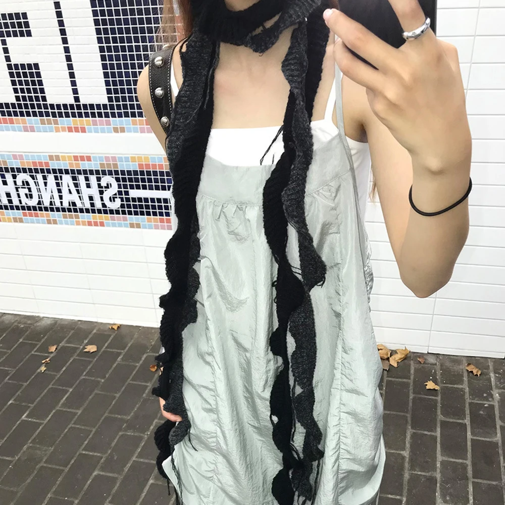 Y2k Girls Ruffle Edge knitted Long Scarf Harajuku Solid Color Skinn...