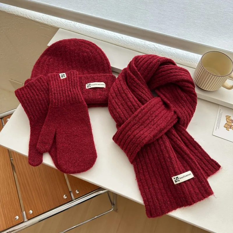 Women's Pure Color Thickened Knitted Three-piece Set Wool Scarf Hat...