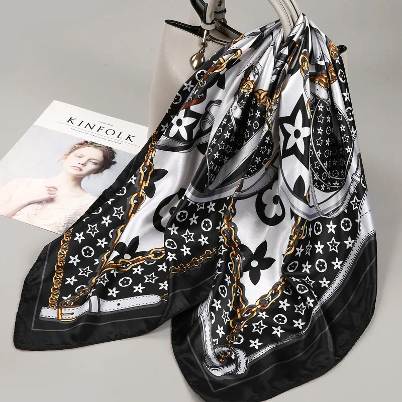 Light luxury 90 Silk scarf imitatingly printed with black and white...