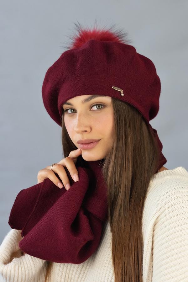 Beret with Pom-Pom and Scarf Set, Wool Angora Winter
