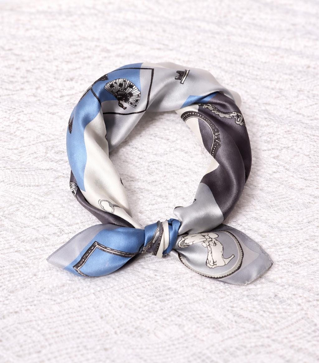 "100% Mulberry Silk Blue Gray Scarf, Vintage Frame Print Square Scarf, Elegant Hair Scarf, Mulb...