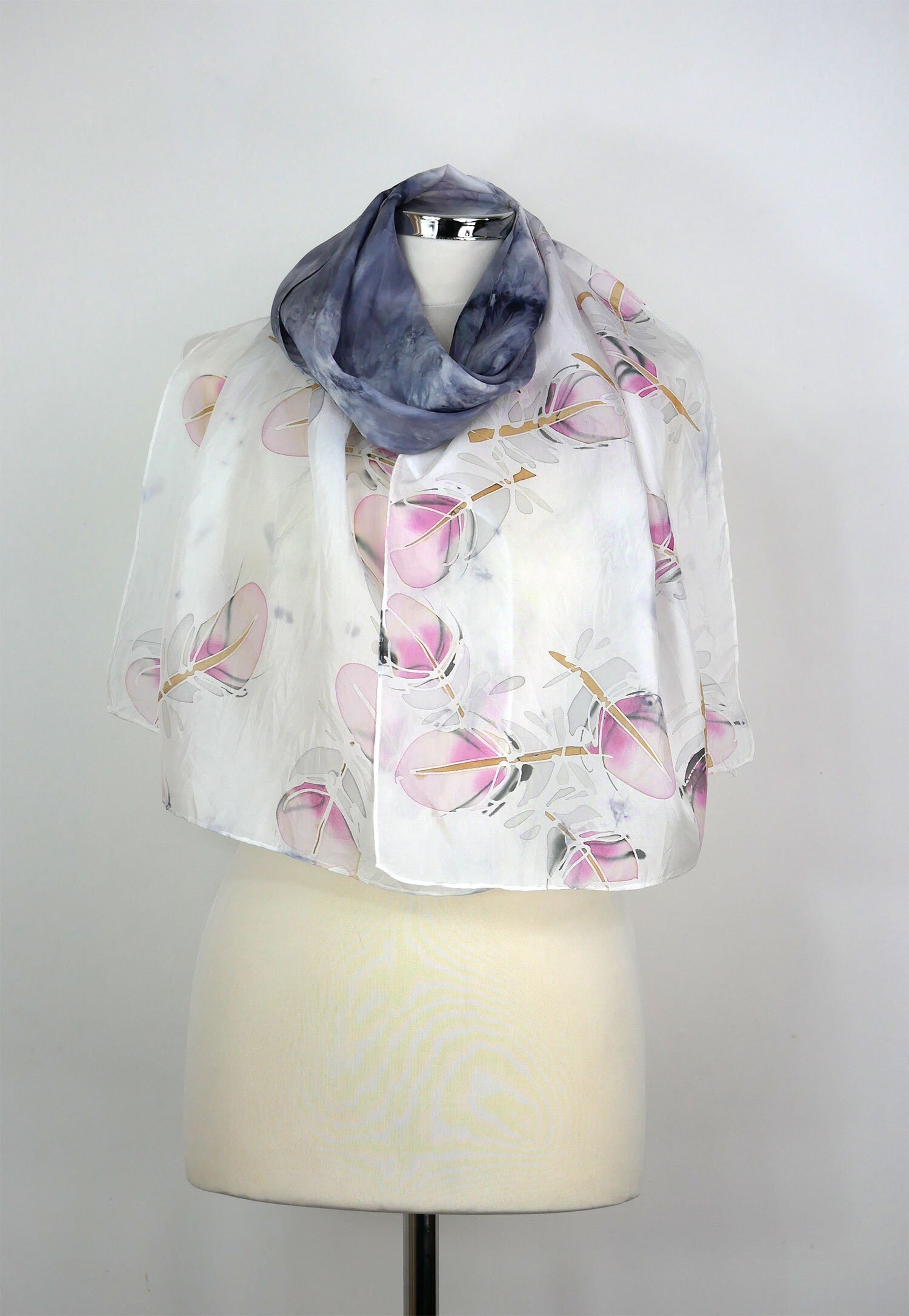 Size: approx. 175 x 43 cm. One of a kind hand-painted silk scarf featuring a whimsical yet subtle de...