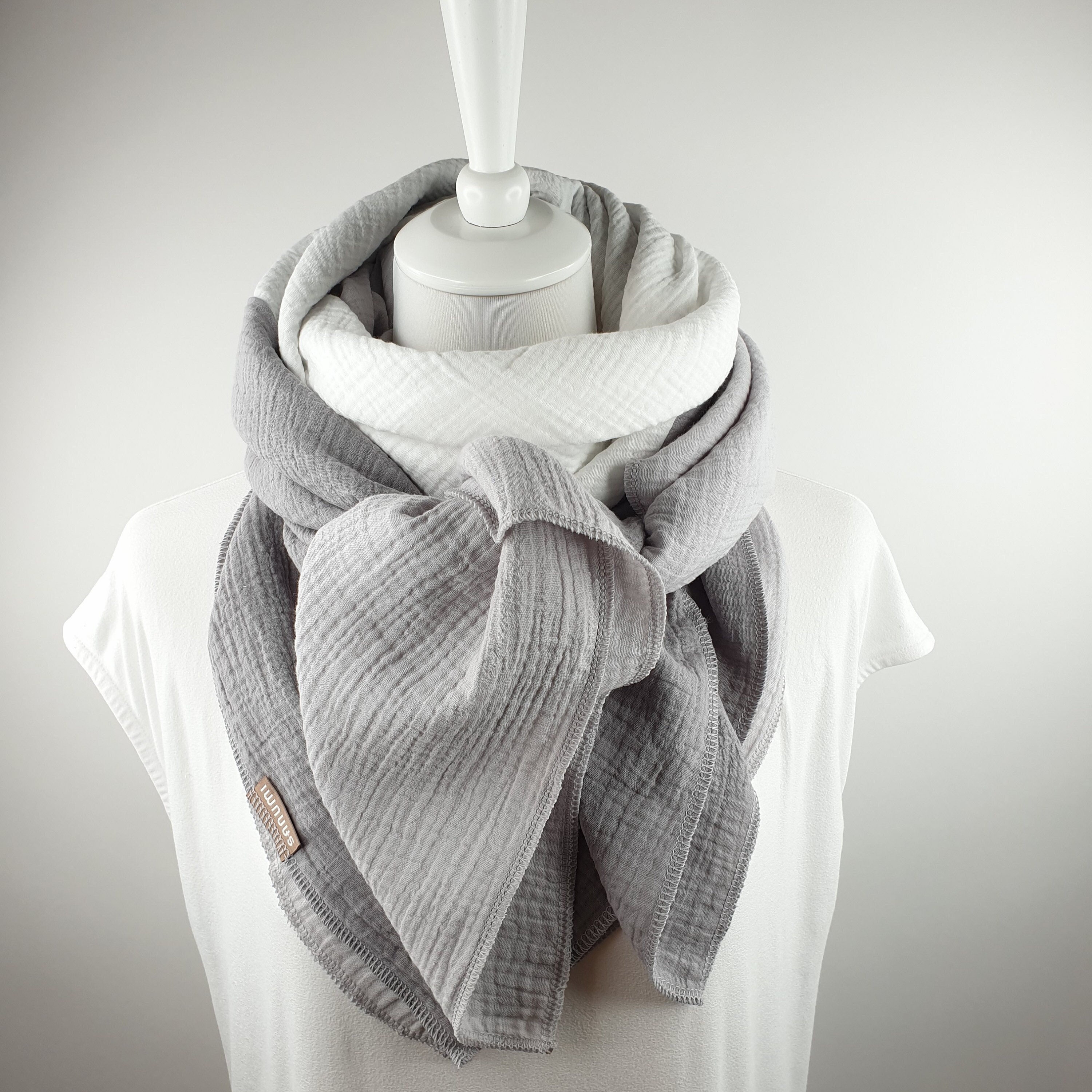 "This muslin scarf for women is handmade in Gemany/Ratingen and has 3 colors in grey white. It ...