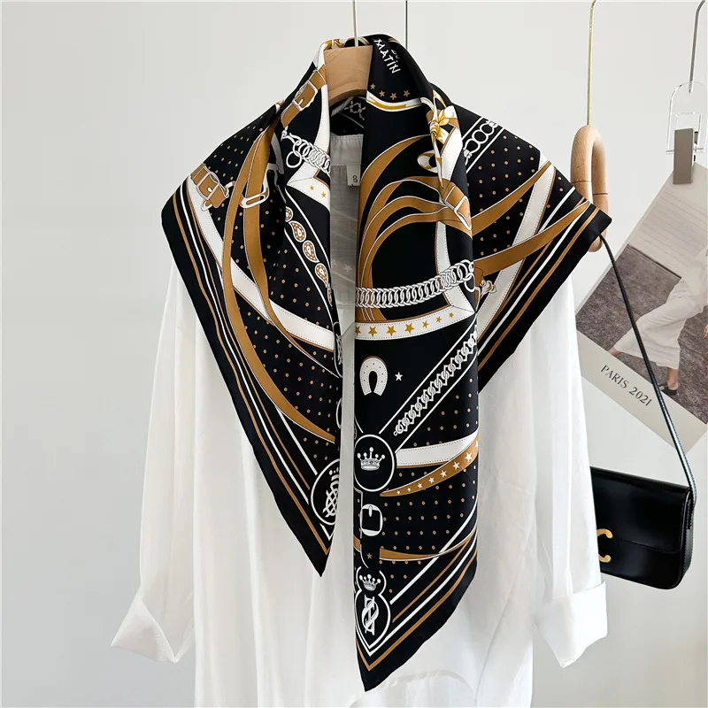 Light luxury 90CM silk-like scarf imitatingly printed with black an...