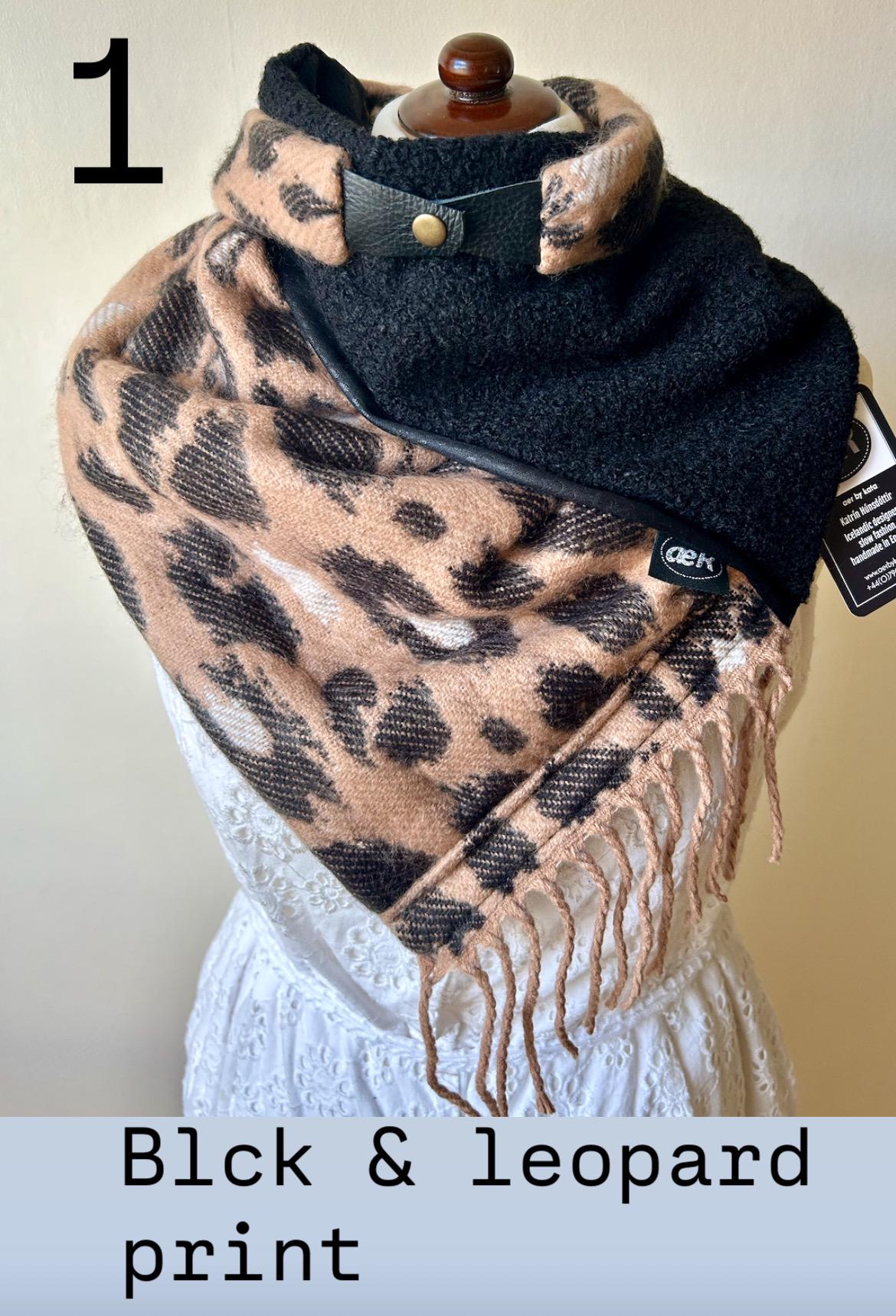 Warm triangle scarf lined with soft polar fleece. wrapped around your neck fastened with leather str...