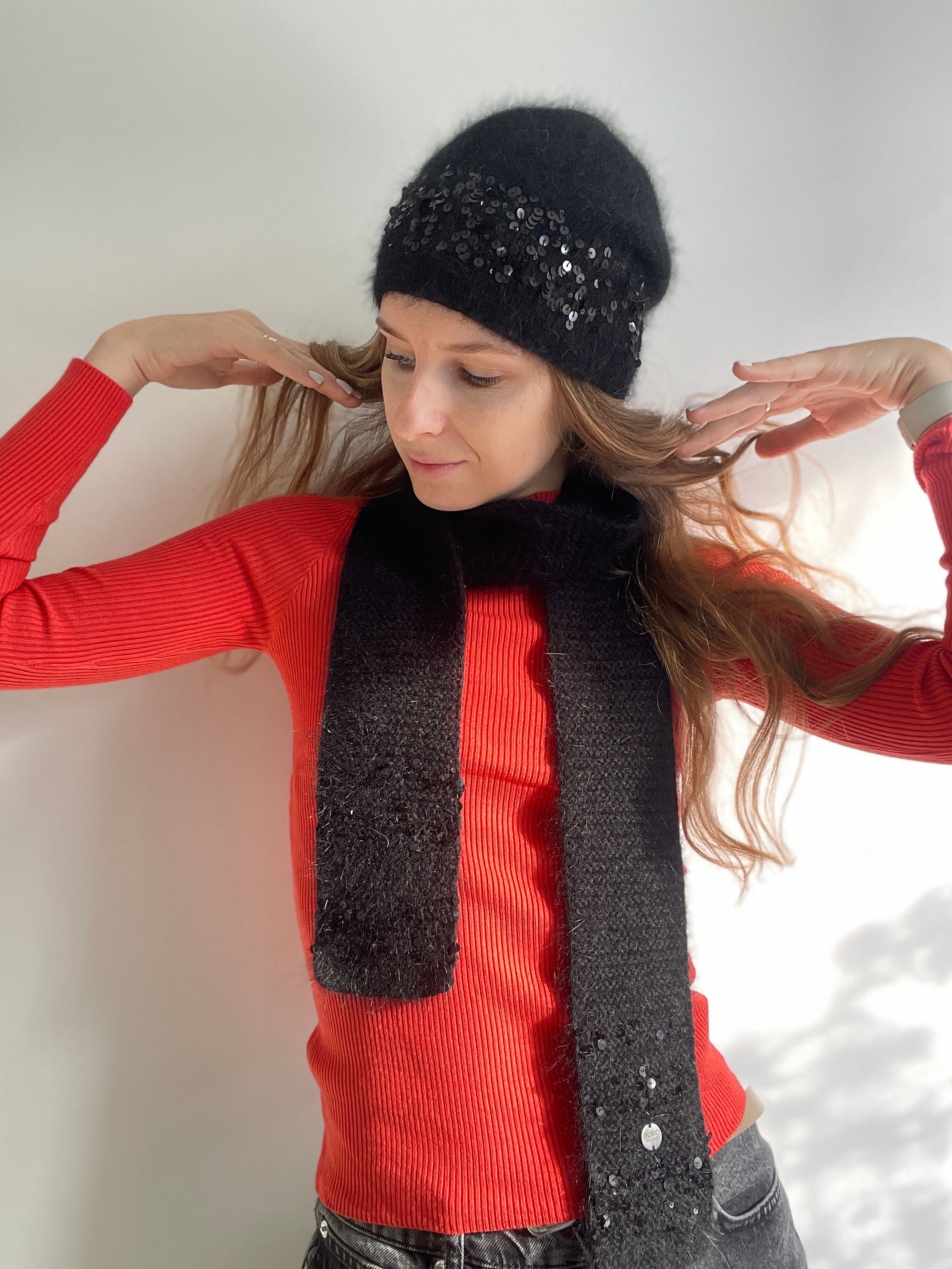 This black handmade scarf is a gorgeous piece of knitwear. Black angora scarf with black sequins at ...