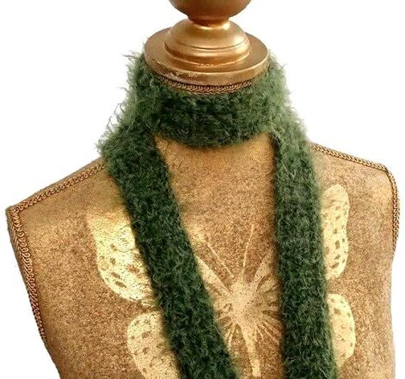 Skinny scarf Fluffy green Skinny knit scarf gift Crochet thin scarf...