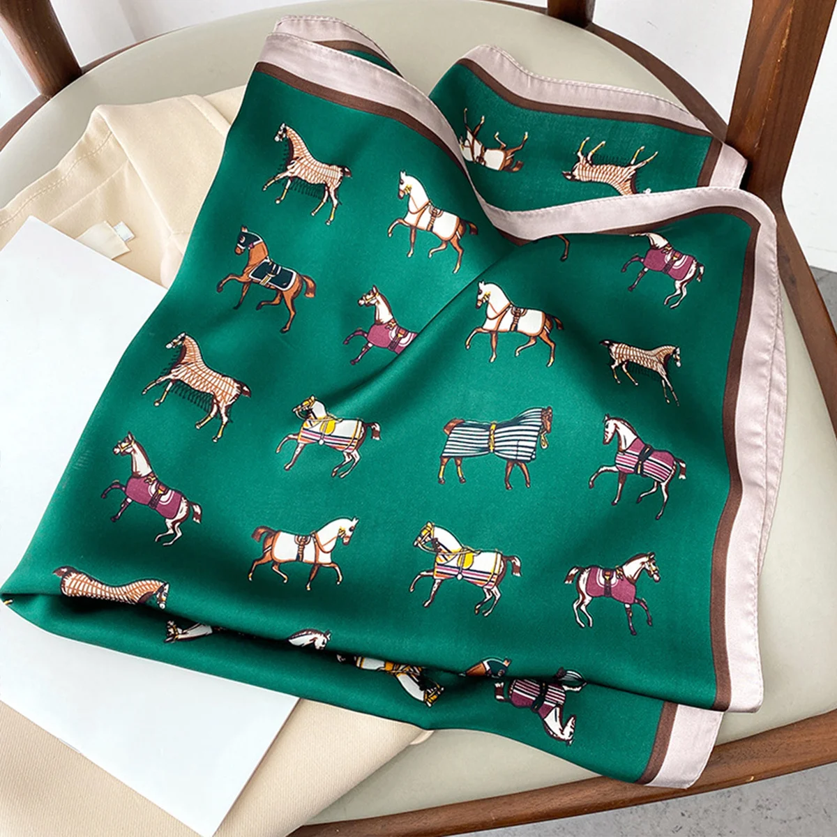 27.5" Dark Green Horse Print Square Scarf Vintage Cartoon Imitation Silk Neck Scarf Bandana Cla...