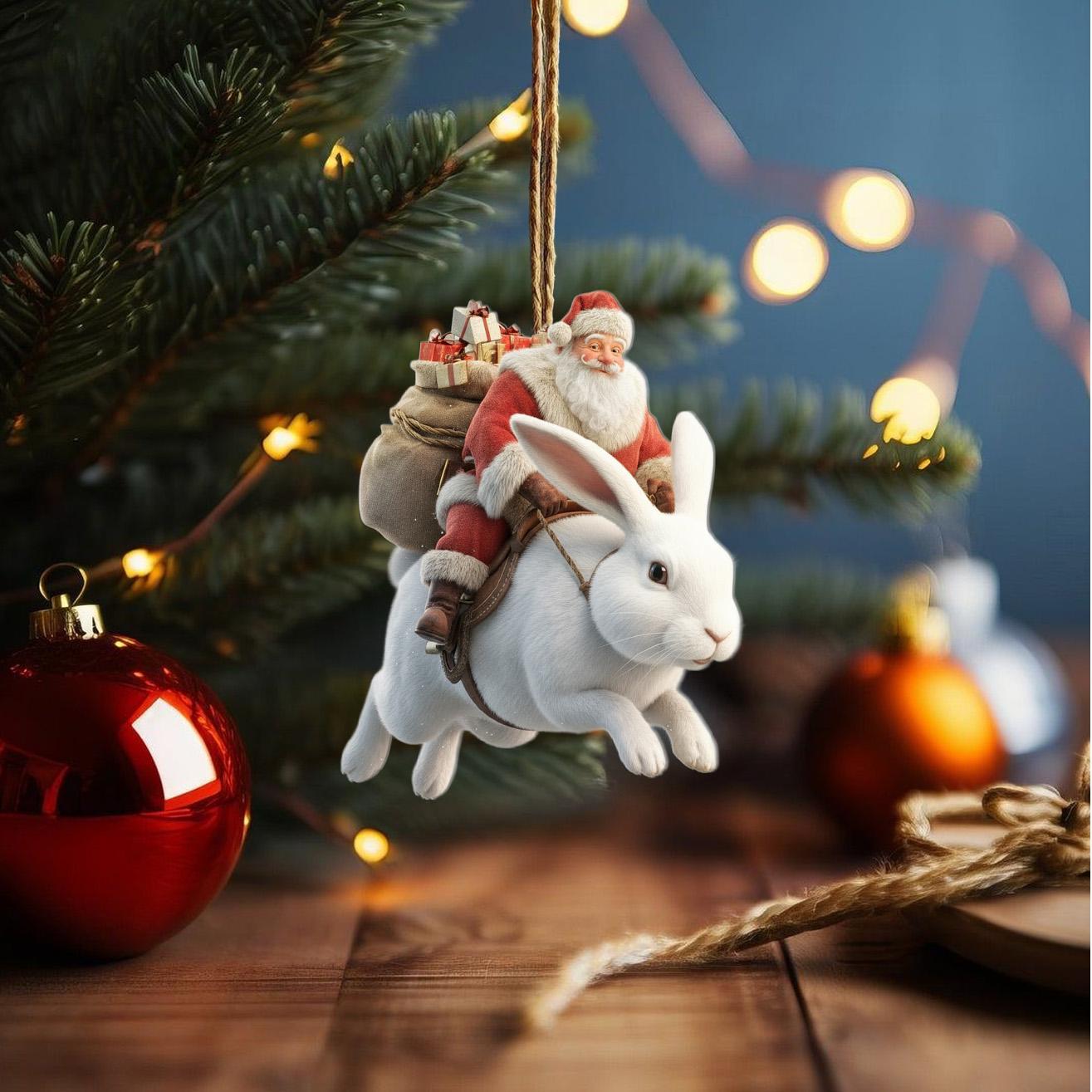 2D Santa Riding Rabbit Ornament, Rabbit Ornament, 2D Flat Rabbit Or...