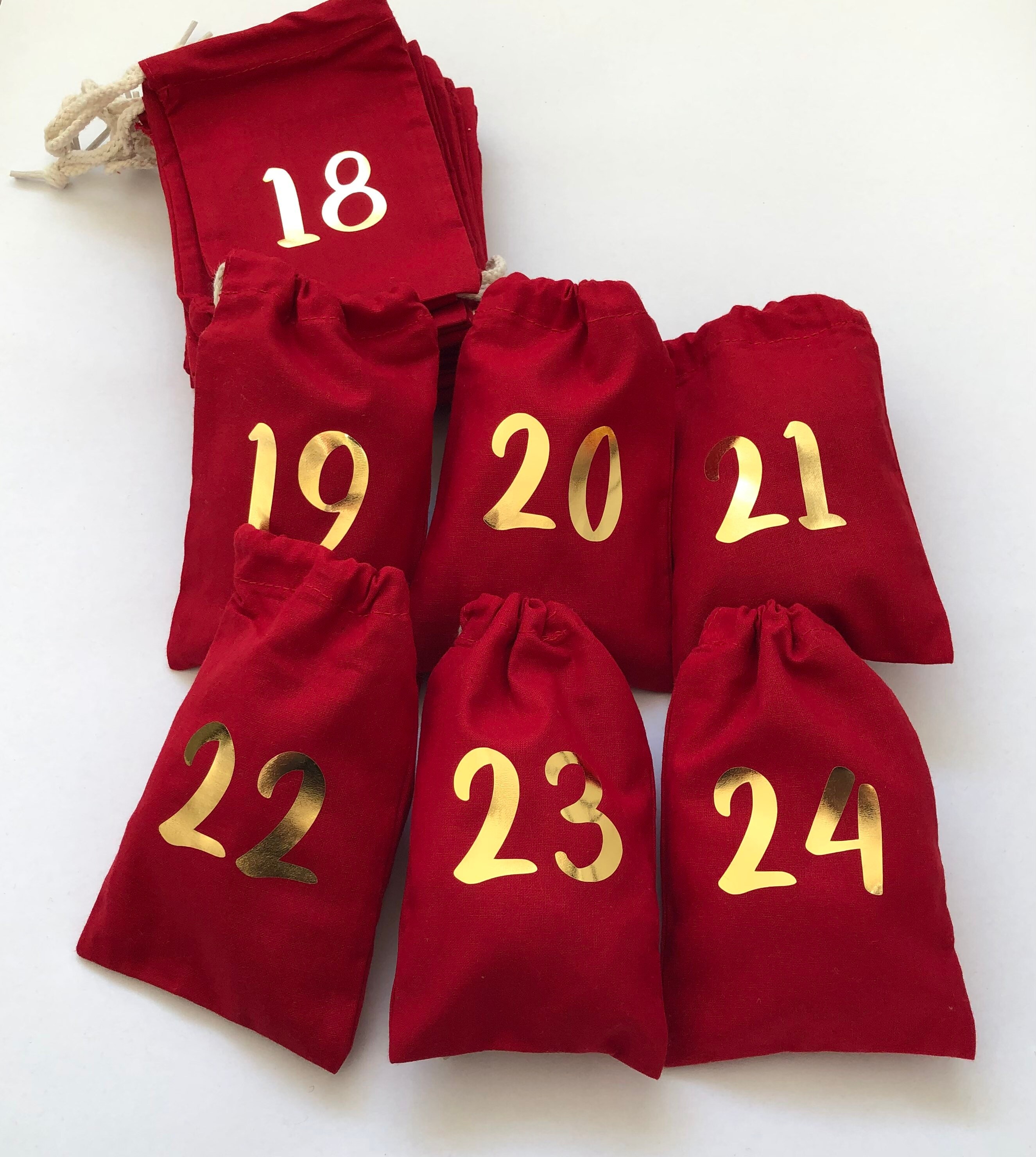Red Christmas Advent Bags Advent Calendar Bags, Numbered Christmas Sacks, 1 -24 Advent Pouches Adven...