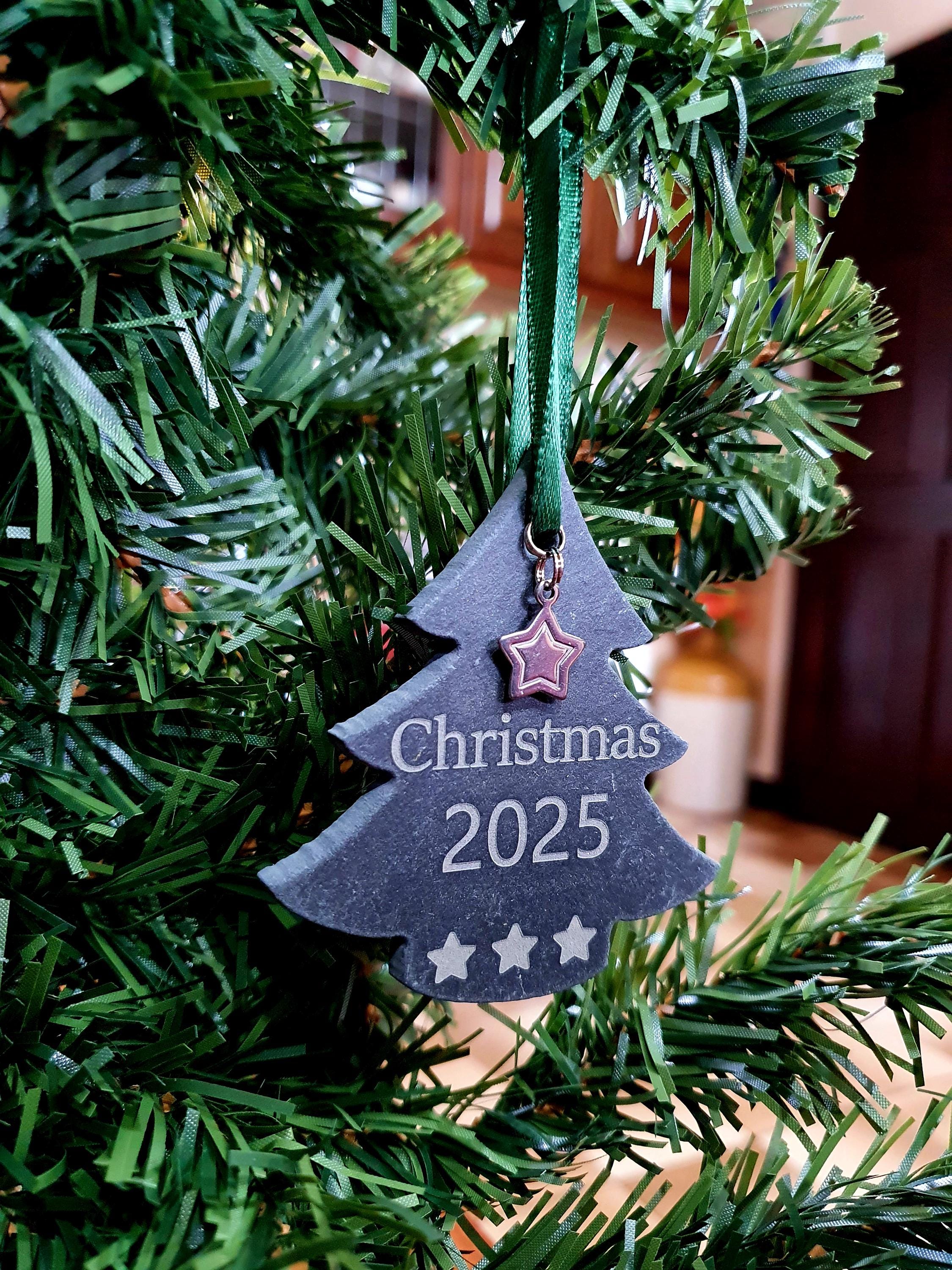 Christmas 2025 Decoration A tree shaped slate bauble engraved with Christmas 2025 and a silver colou...