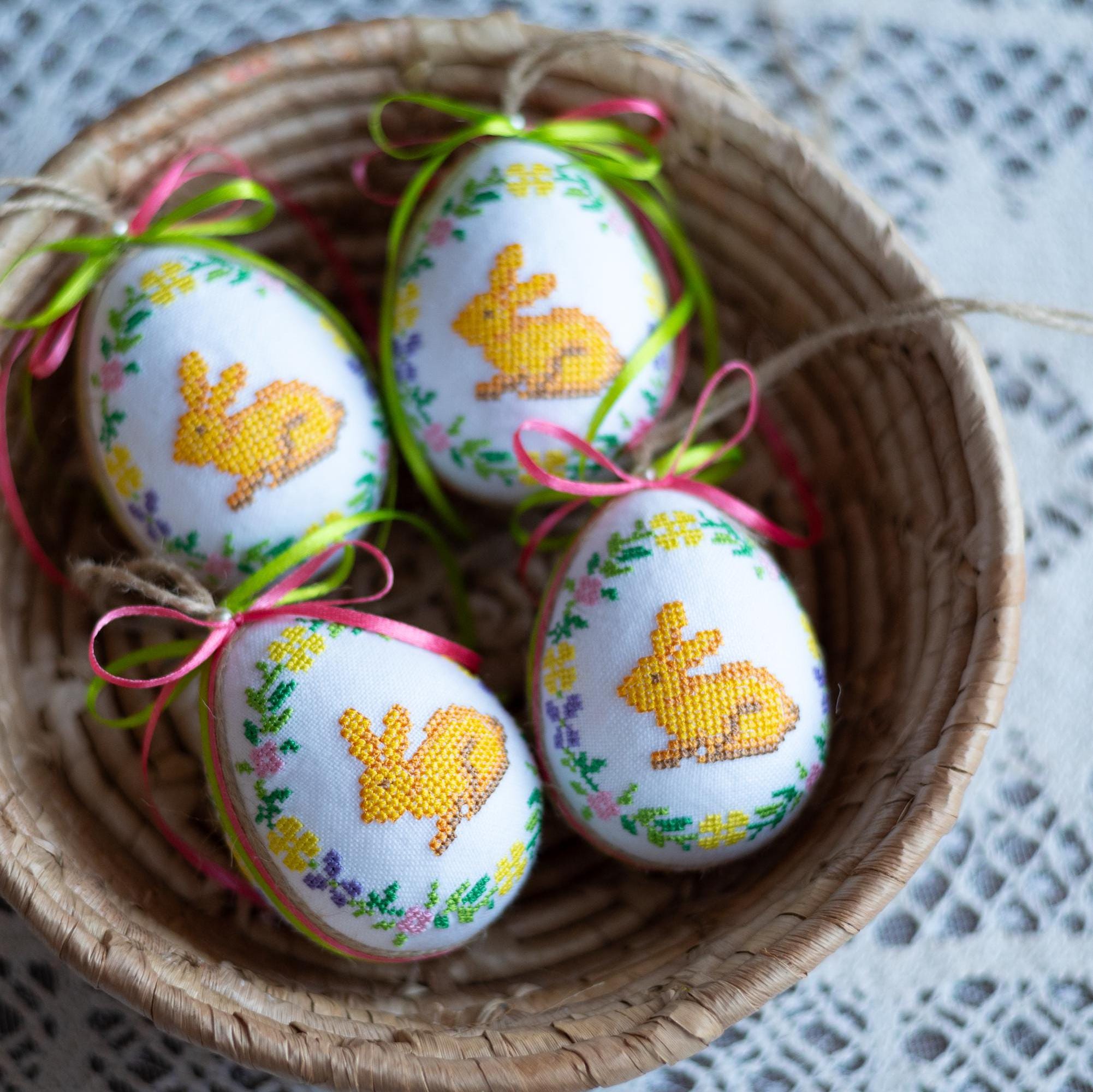Set of 4 decorated Easter eggs. Each decorated Easter egg has Easter bunny embroidery on both sides....