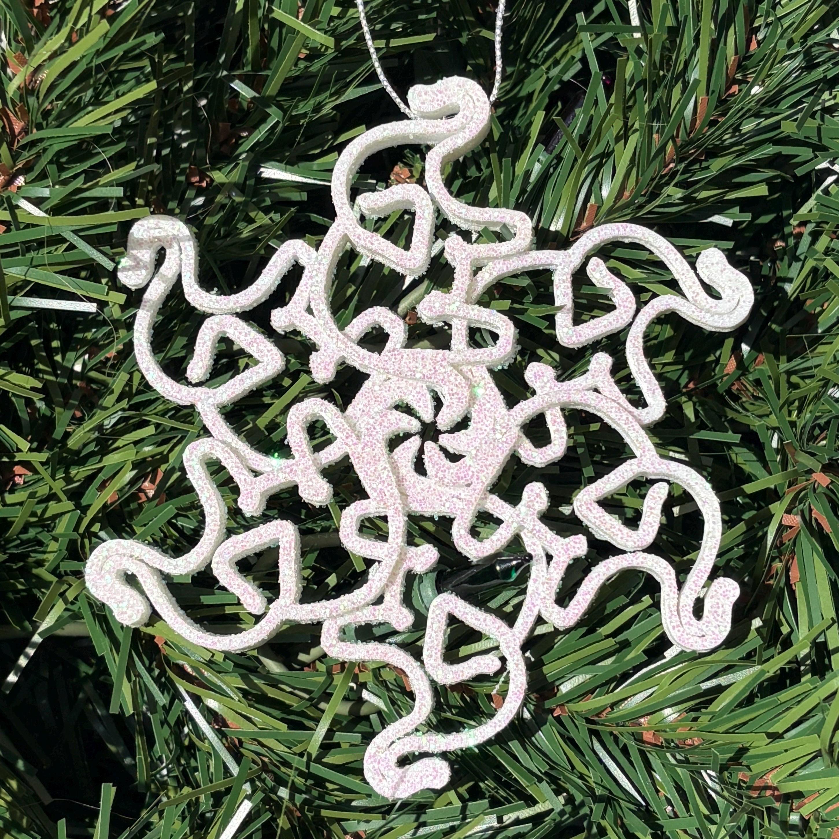 "This Christmas ornament features elephants intertwined in a snowflake pattern - making the per...