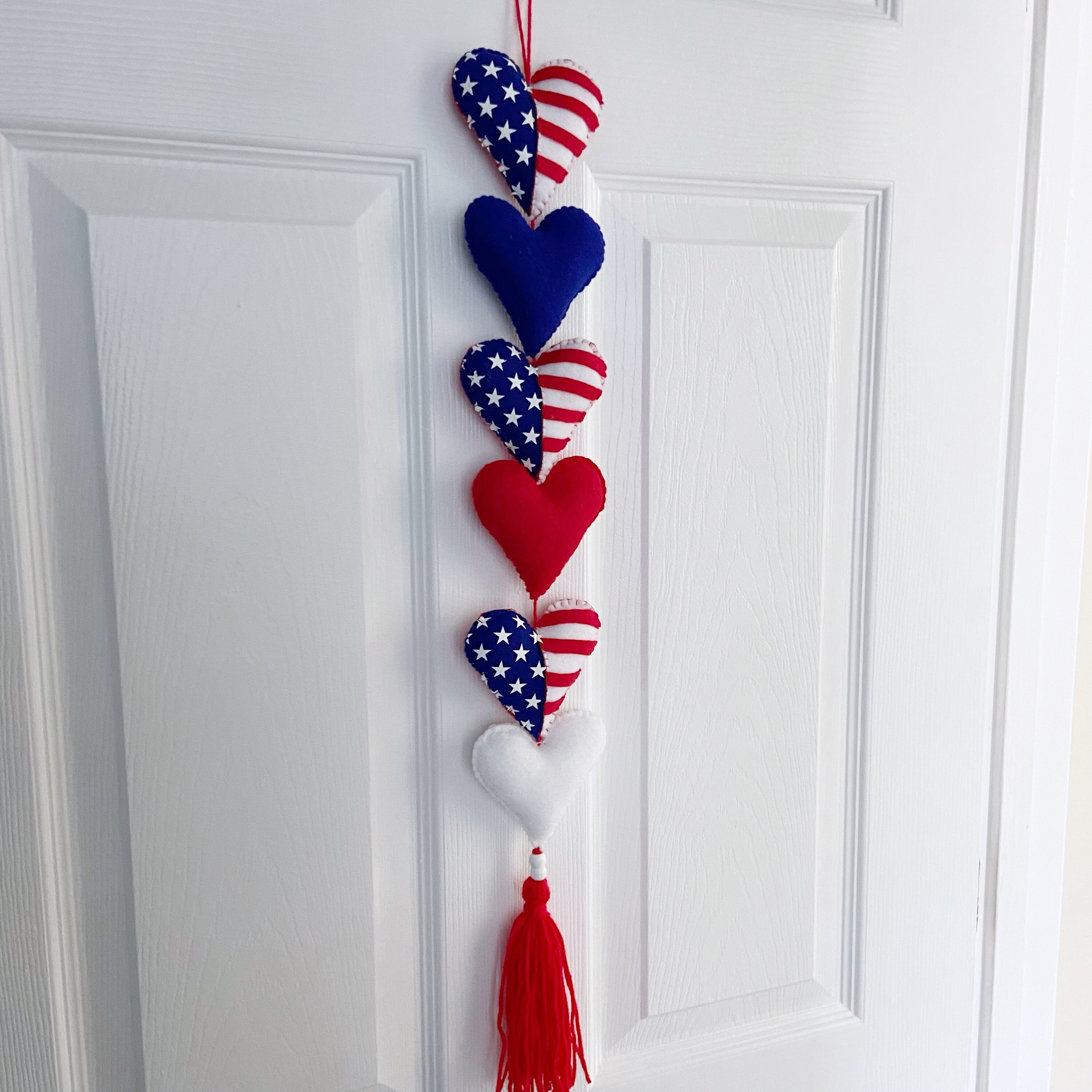 "Beautiful 4th of July Felt Door Hanger. Perfect shaped patriotic hearts to decorate your favor...