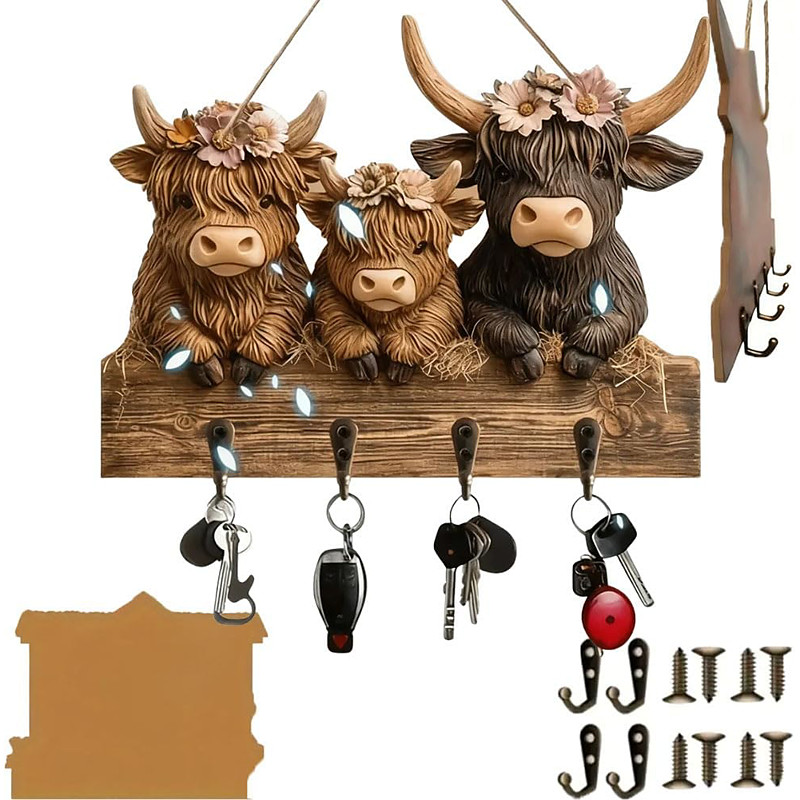 Rustic Highland Cow Wooden Family Key Holder Hanging Ornament with ...