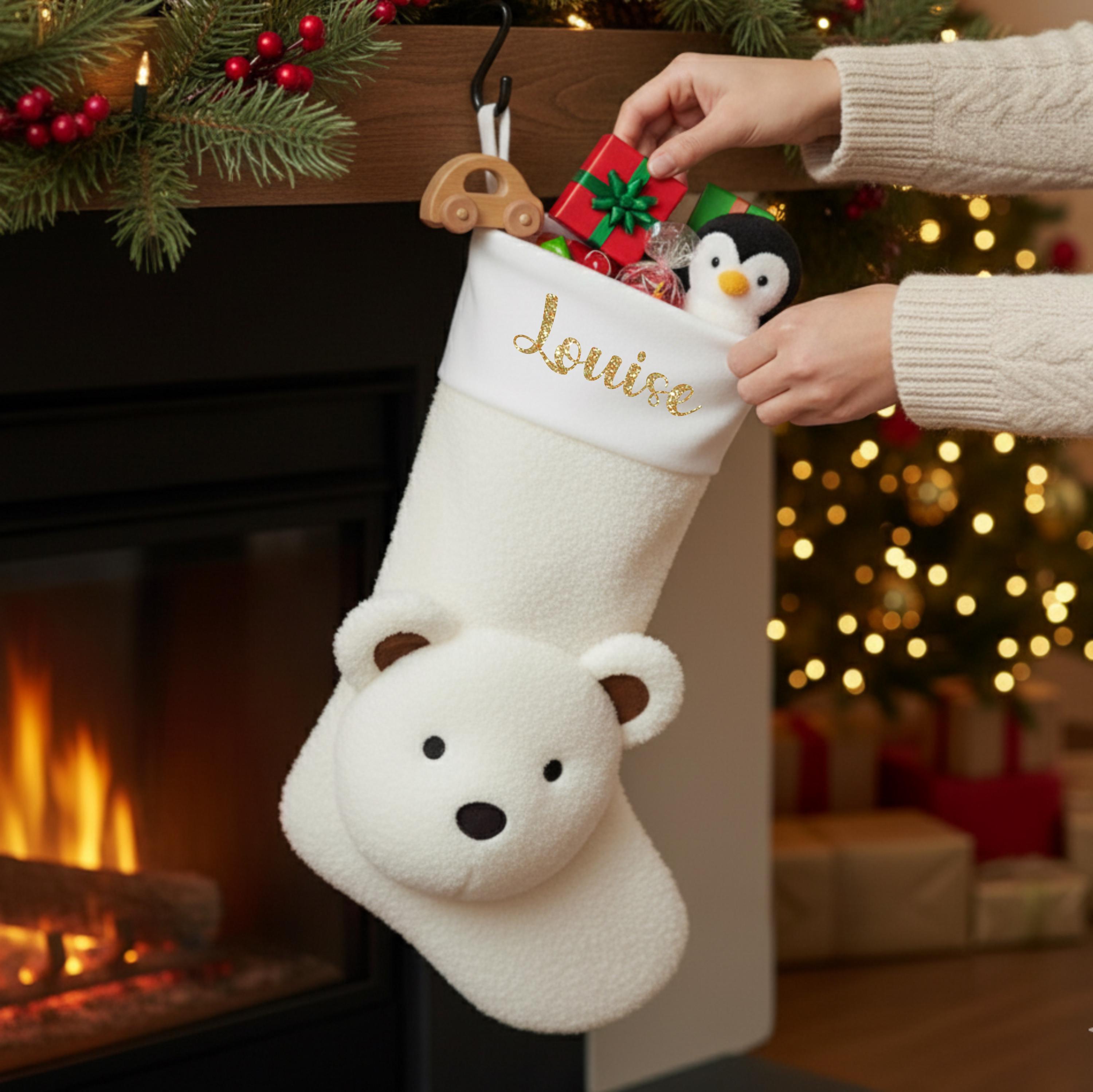 Personalized Christmas Stocking - White and Brown Bear with First Name, Advent Calendar Gift, 3D Rei...