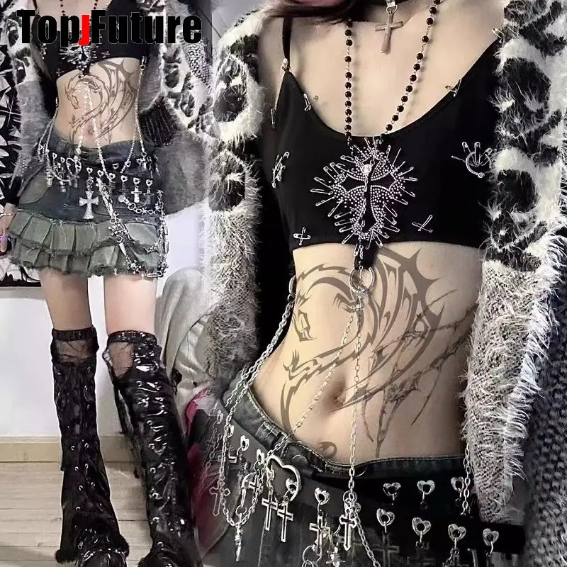 Women Girl Gothic Lolita Punk Harajuku streetwear Y2K girl skull hand make Bikini Bling Bling Tank T...