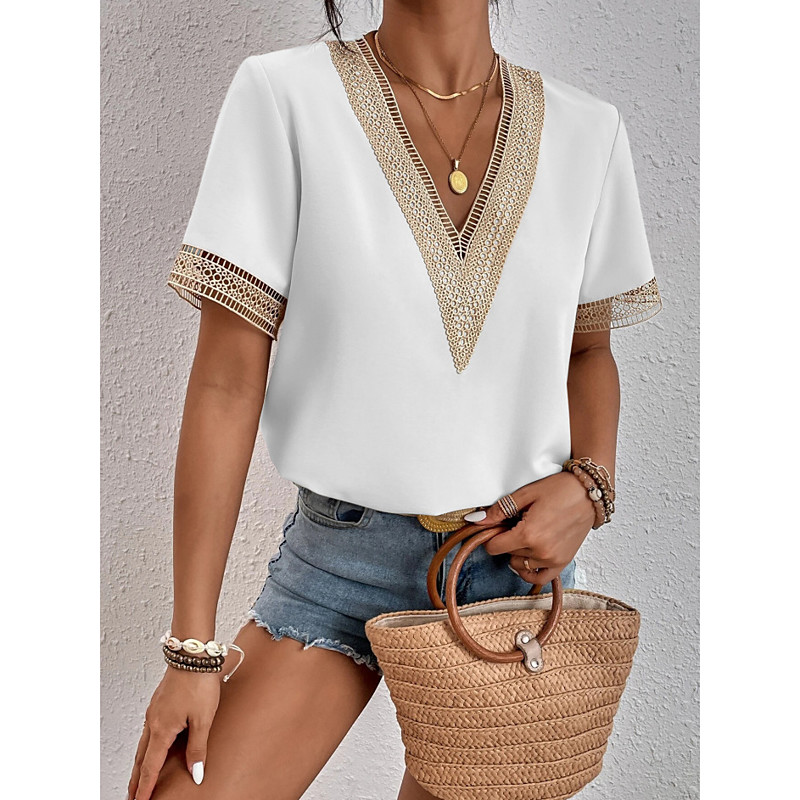 Women's White Elegant Lace Tops Eyelet Blouse Casual Solid Color Ti...