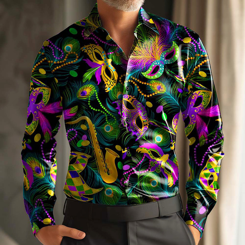 Mardi Gras Men's Carnival Beads Mask with Feathers Shirt Satin Shir...
