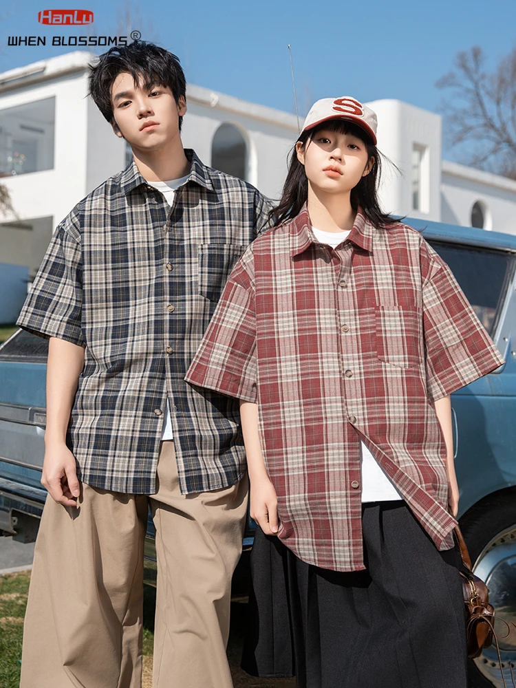 HANLU Summer Streetwear Unisex Oversized Cotton Shirt American Vintage Casual Lapel Short Sleeve Che...