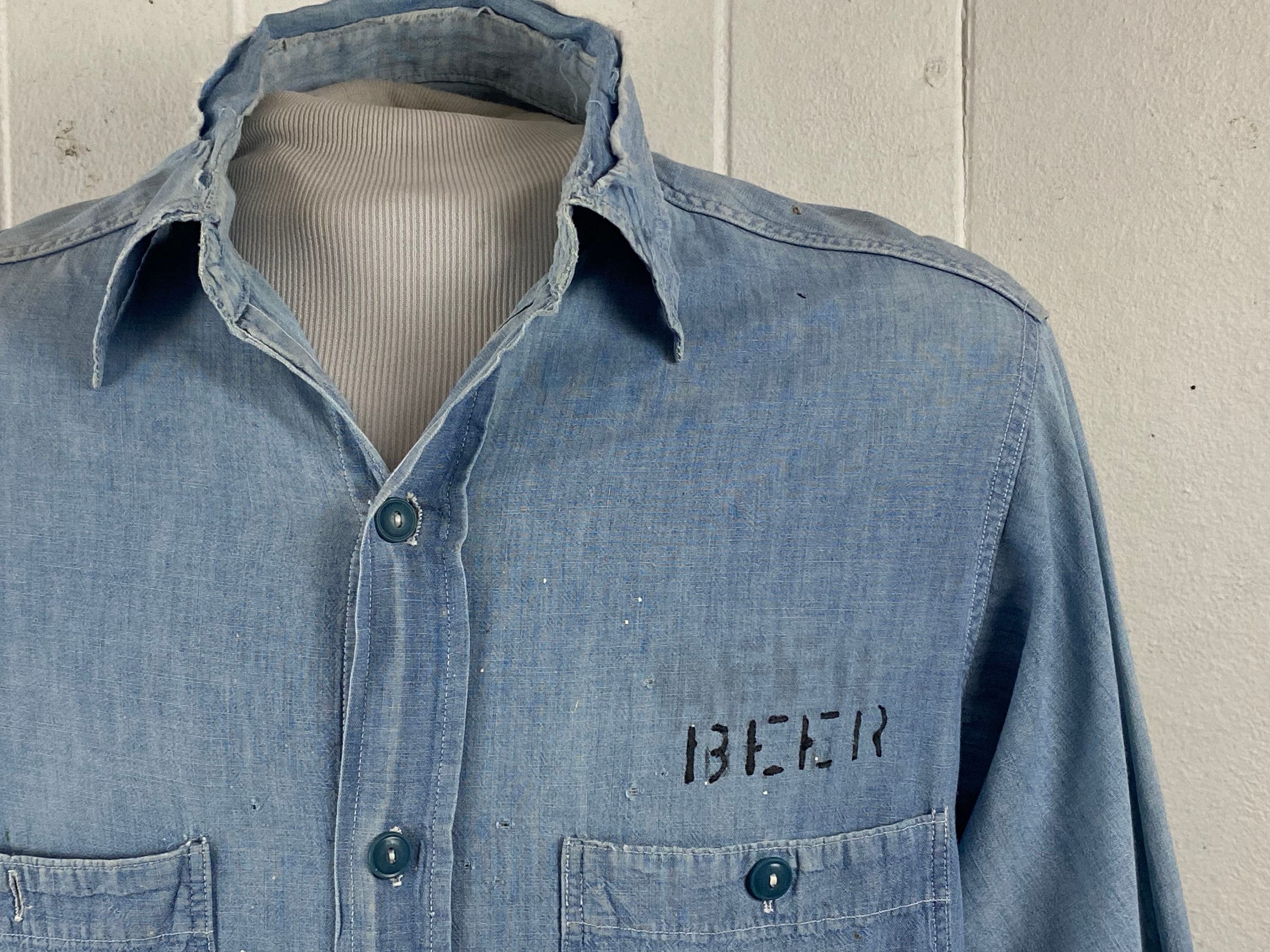 "Vintage 1940s WWII work shirt. Made of blue cotton chambray. U.S. military issue, probably U.S...