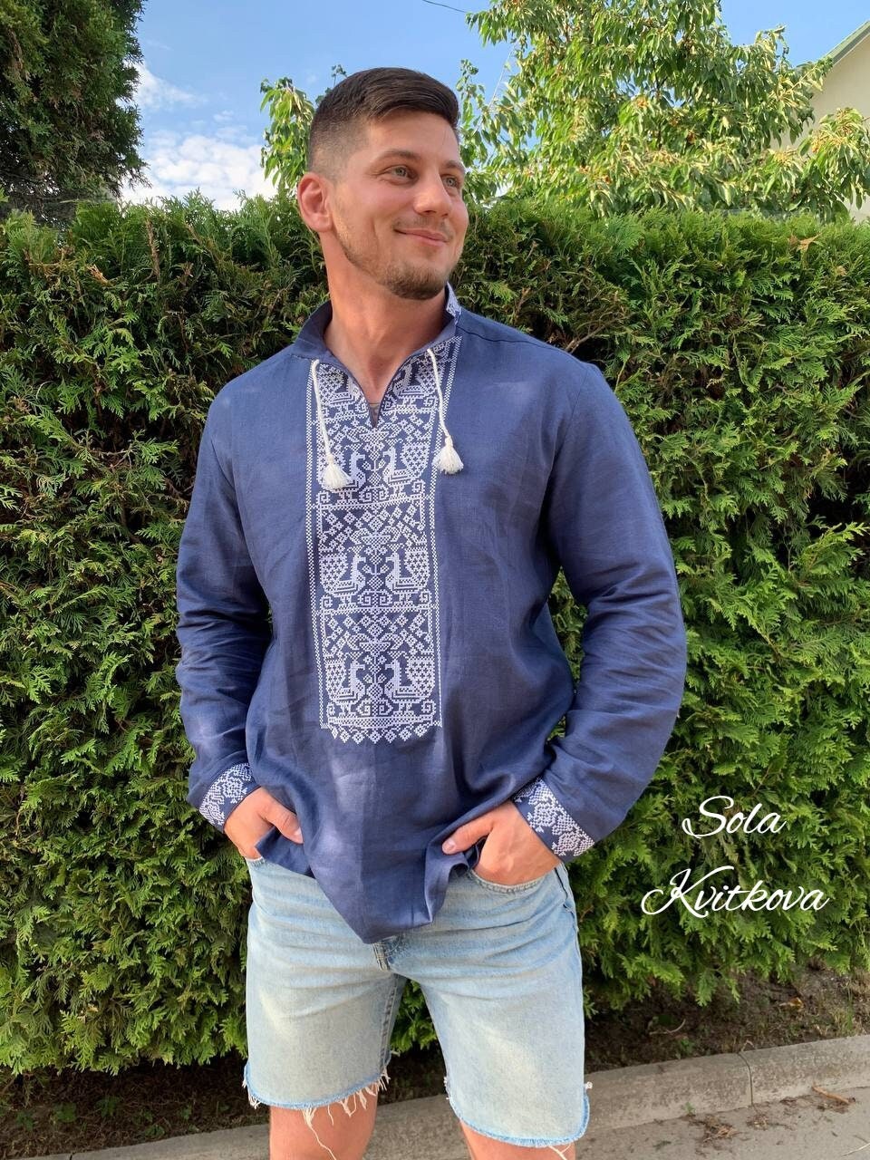 Embroidered trendy navy blue linen mens shirt by Sola Kvitkova of a straight, free cut. Vyshyvanka w...