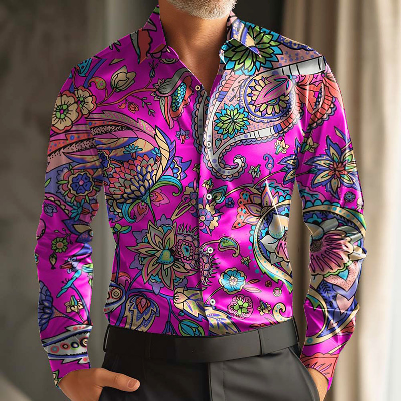 Men's Paisley Floral Print Ethnic Shirt Button Up Shirt Stand Colla...