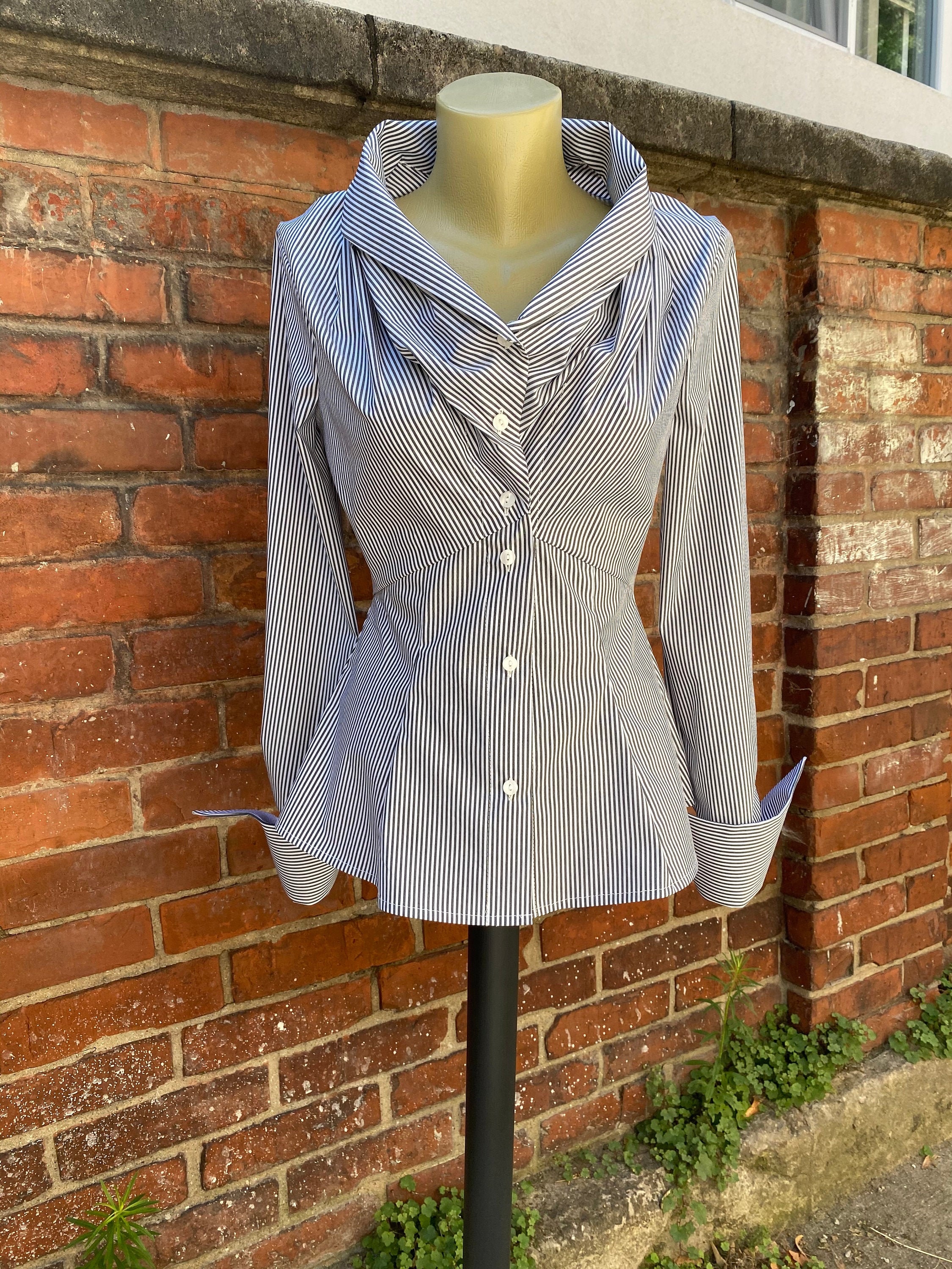 "This white striped cotton shirt has the perfect body fit.The cowl neck makes it feminine and p...
