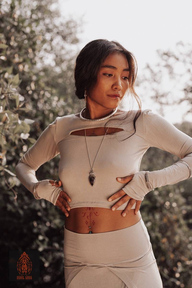 Handmade designer stretch bamboo long sleeve crop top with thumb holes and cut out design. Independe...