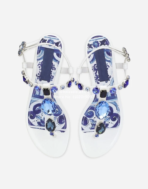 Women Patent Leather Thong Sandals with Embroidery Printed Jewel Flat Buckle Fastening Ankle Strap 3...