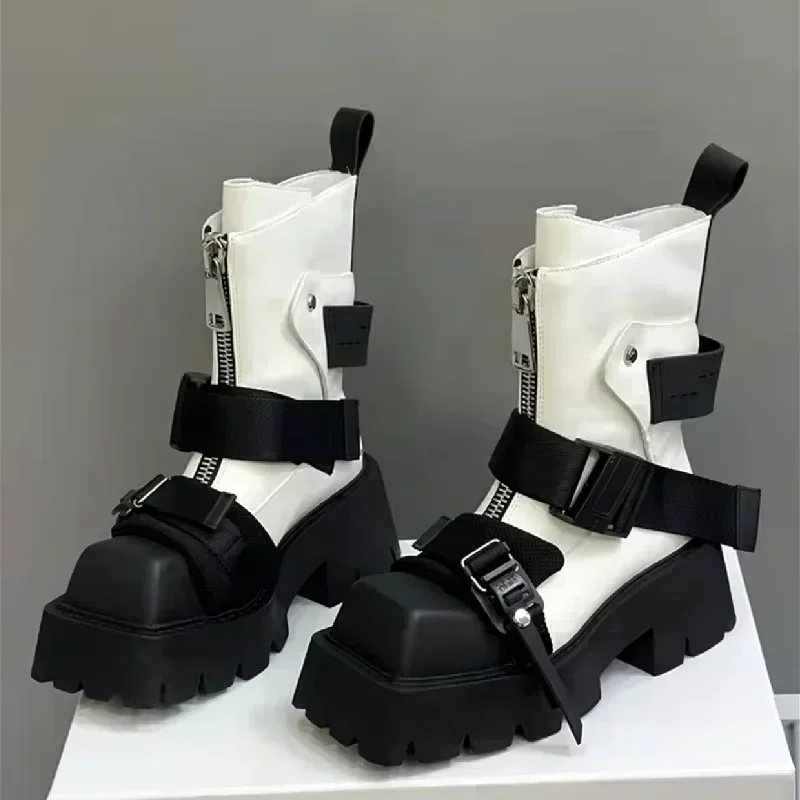 Leather Ankle Boots Women Zip Belt Buckle Strap Design Motorcycle Boots Thick Bottom Non-slip Platfo...