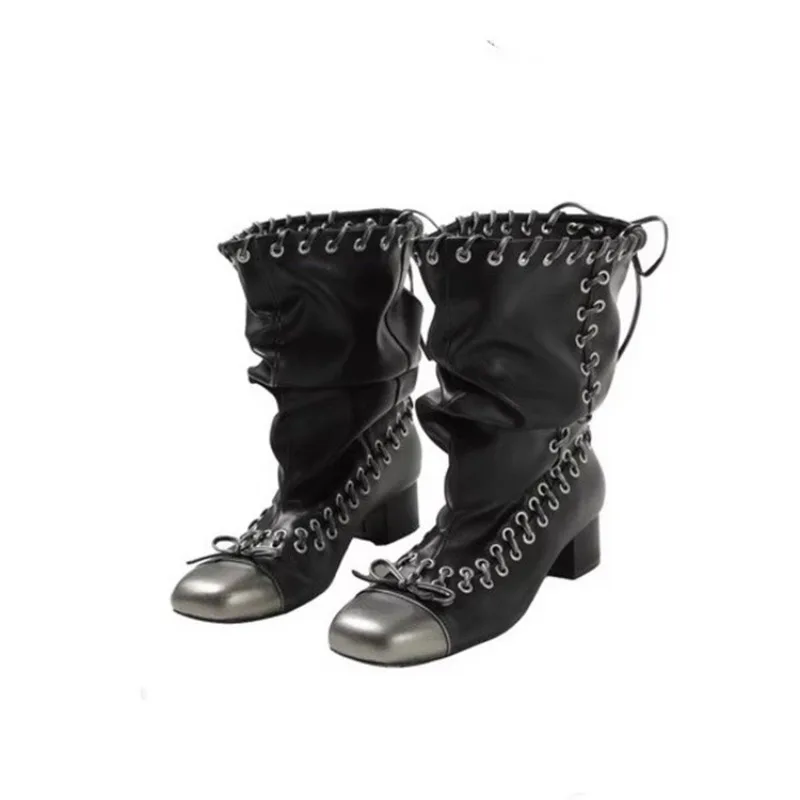 Square Toe Lace-Up Bow Pleated Fashion Boots Vintage Big Barrel Gir...