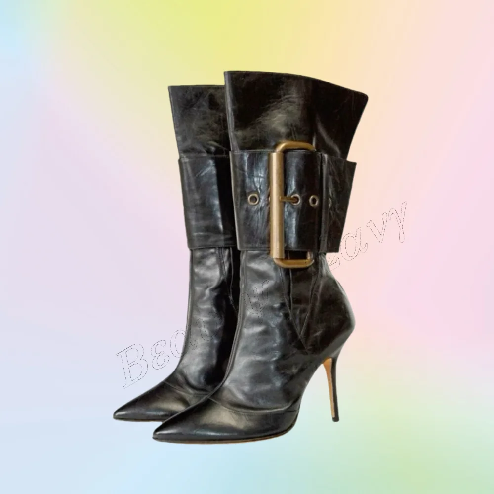 Black Side Big Buckle Decor Boots Mid Calf Belt Belt Pointed Toe Sh...
