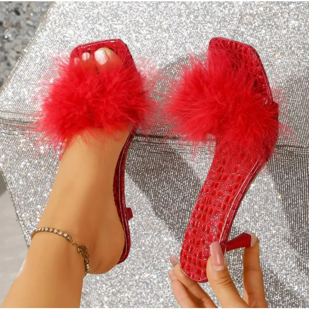 2024 Woman Feather High Heels Pointed Toe Slippers Fashion Sandals ...