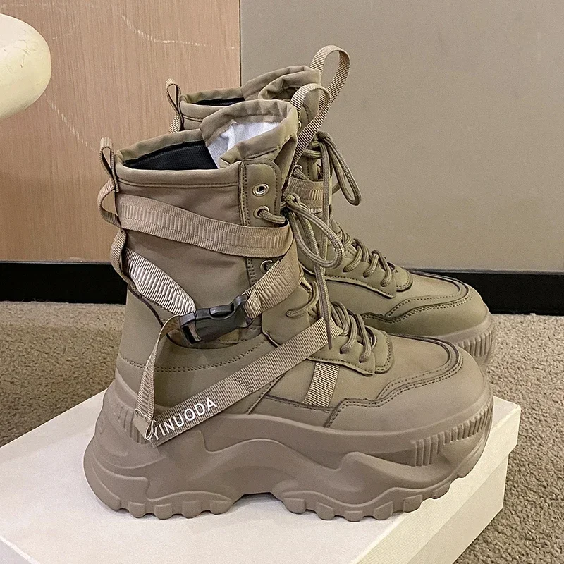 Hot Fashion Women Chunky Platform Motorcycle Boots White Lace Up Thick Bottom Shoes Woman Autumn Win...