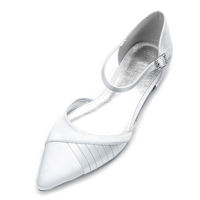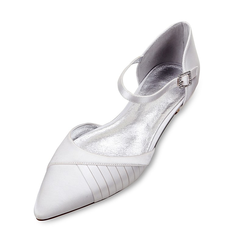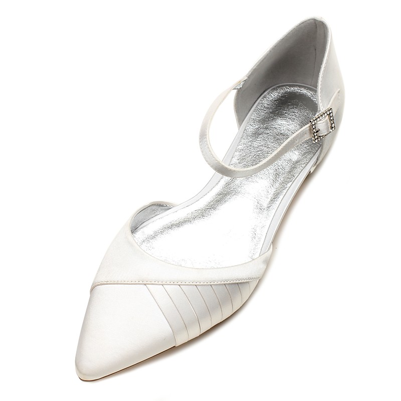 White Satin Flat Wedding Sandals with Pointed Toe, Ankle Strap, and...