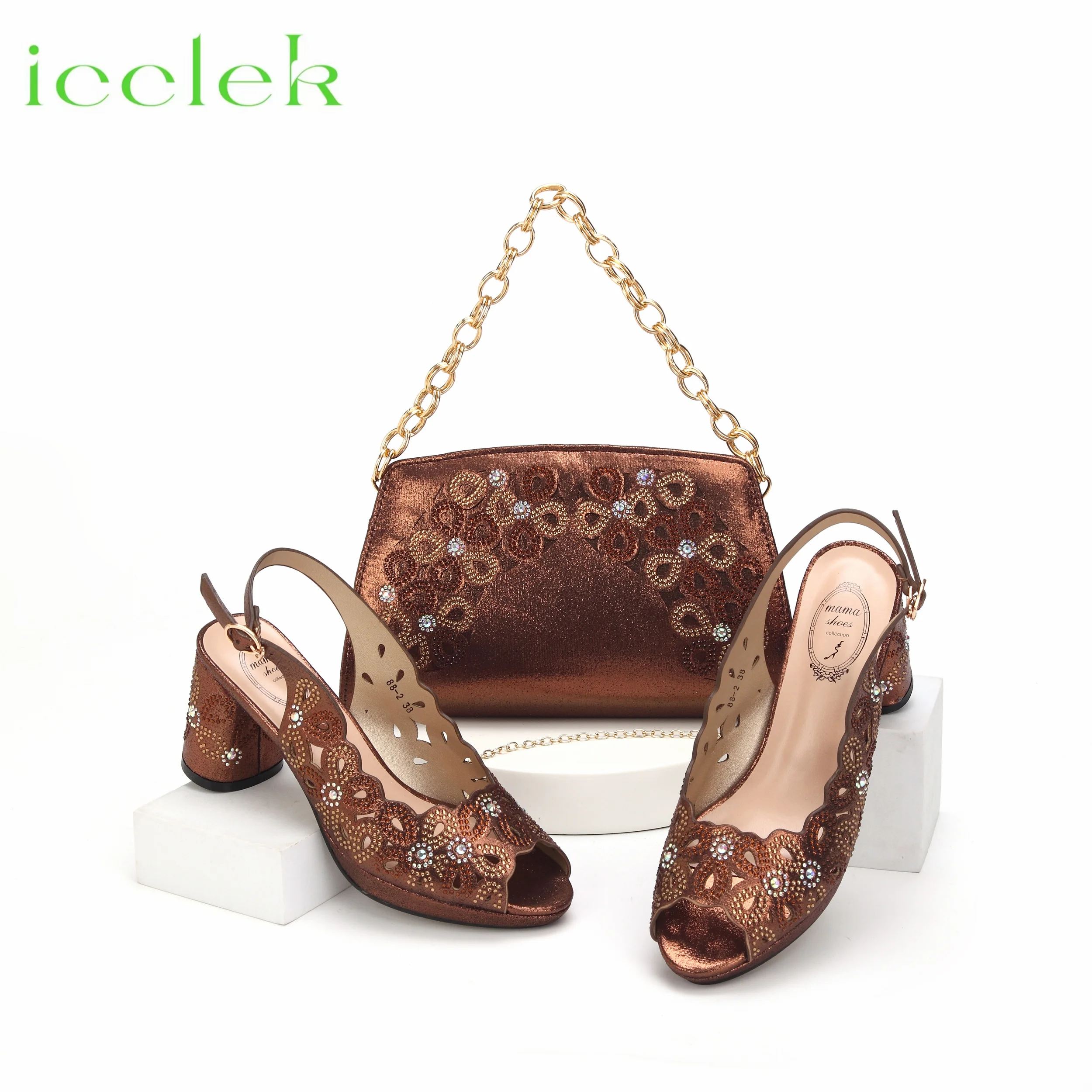 Coffee Color Elegant Comfortable Low Heels Shoes and Bag Set Decoration Rhinestones Women Sandals fo...