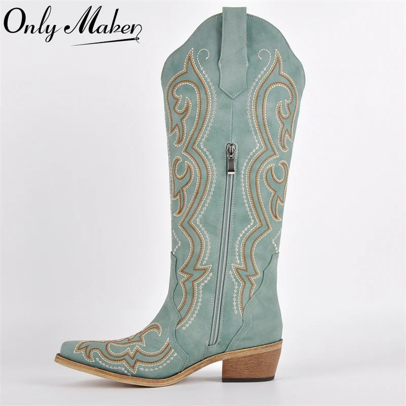 Onlymaker Women Pointed Toe Side Zipper Knee High Embroidery Western Cowgirl Boots Chunky Heel Embro...