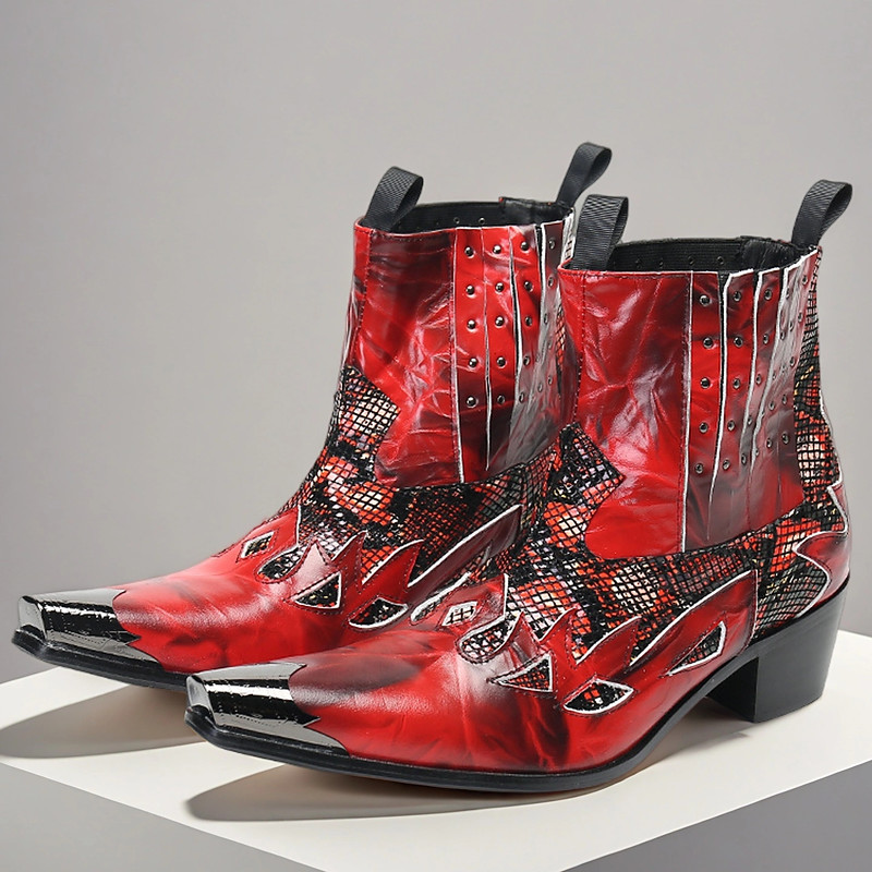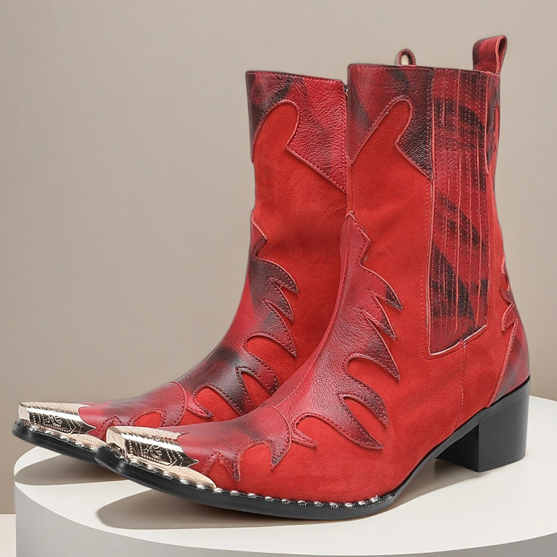 Men's Red Genuine Leather Cowboy Boots – Flame Pattern Wester...