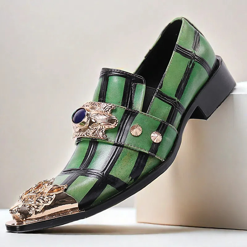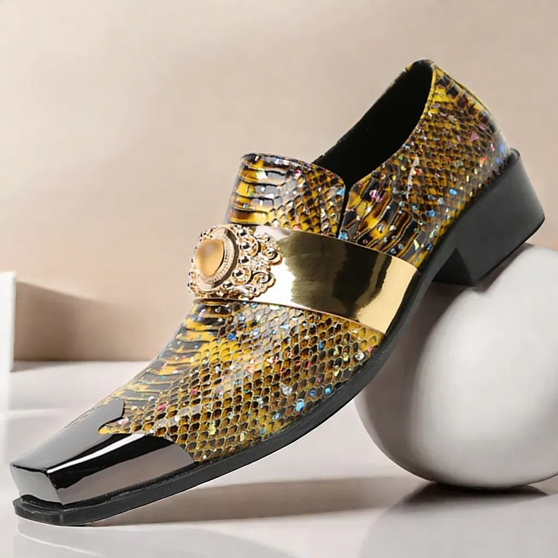 Men's Snake Print Leather Slip-On Dress Shoes with Gold Tip Gold Me...