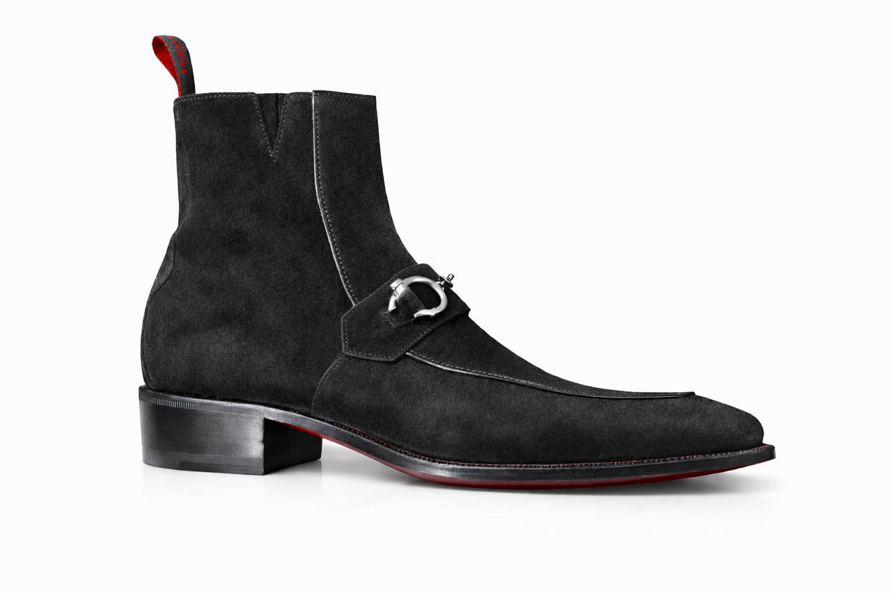 The 'Filmstar' boot on our new Anderson last shape. Handcuff trimmed saddle zip boot in Black suede.