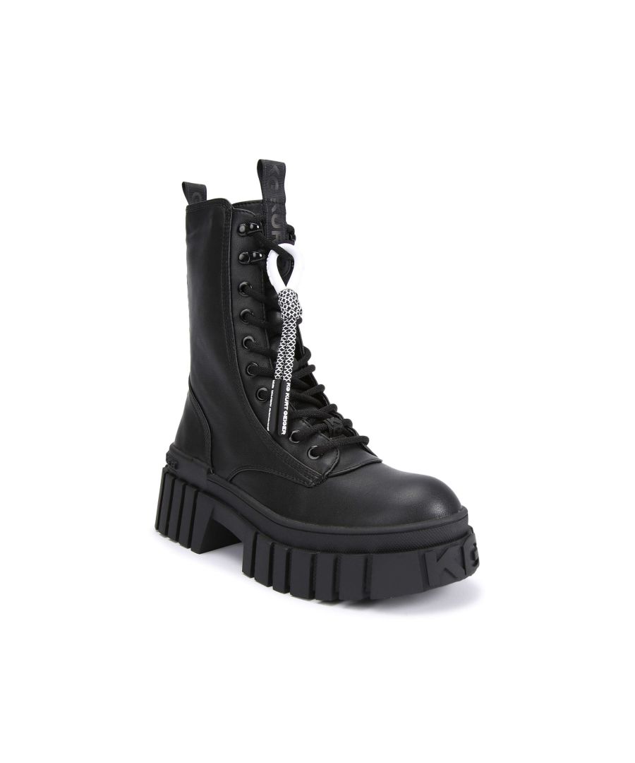 The Tegan Lace Up boot features a KG Kurt Geiger logo printed on ribbed textile with print stitch de...