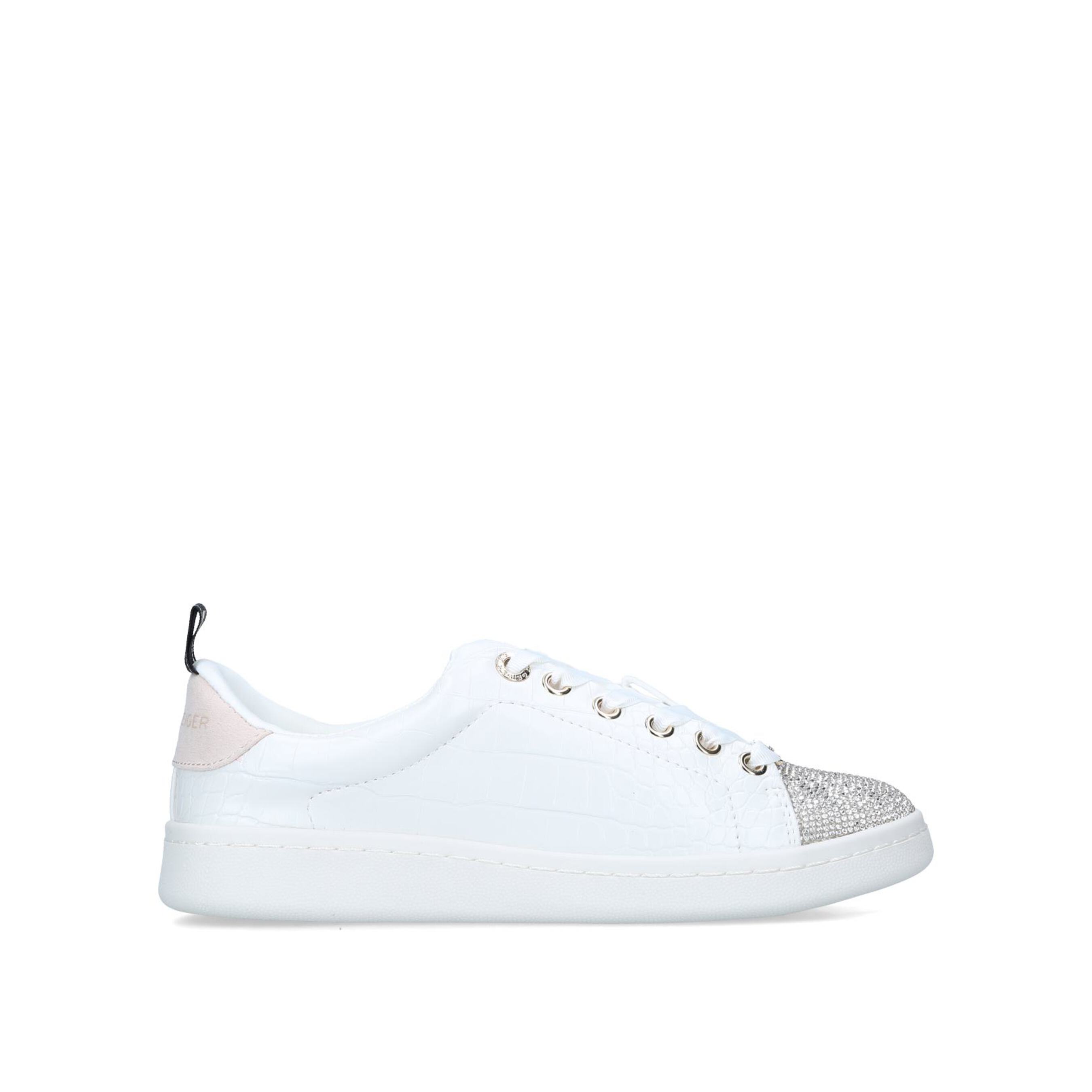 Liza2 by KG Kurt Geiger is a white vegan lace up sneaker with a branded plaque and an embellished to...