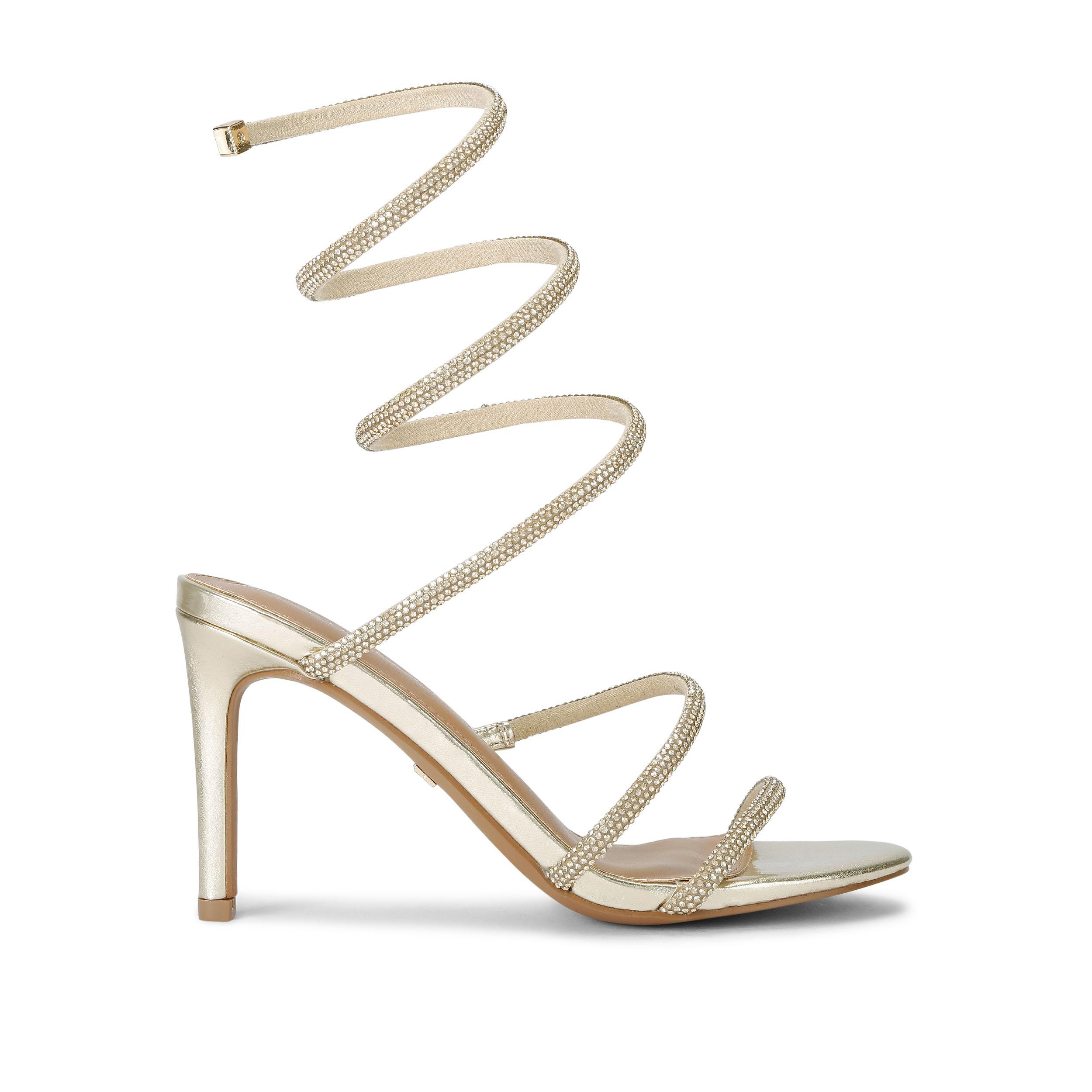 This Athena heel is crafted in gold with a gold crystal embellished spiral ankle strap. The heel is ...
