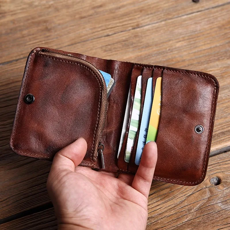 Handmade Men's Short Vertical Leather Wallet Soft Leather Zipper Retro Folded Calfskin Simple Money ...