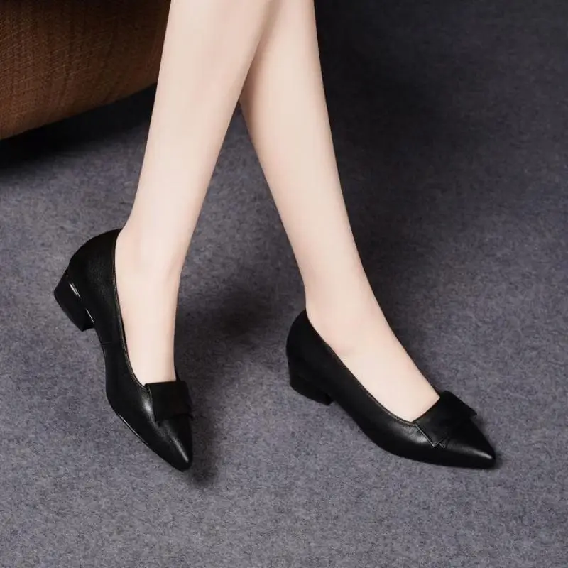 New Spring Women's Pointed-Toe Chunky Heel Pumps, Soft Leather Low-Heel Work Shoes, Minimalist Versa...