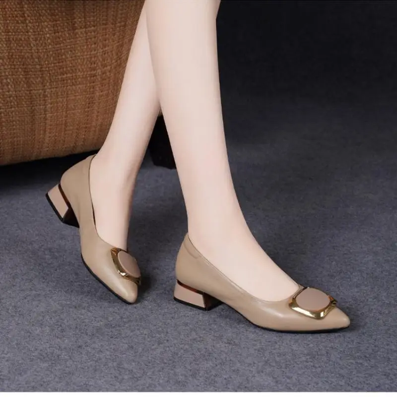 Spring Women's Pointed-Toe Chunky Heel Pumps, Soft Leather Low-Heel Work Shoes, Metal Buckle Decorat...