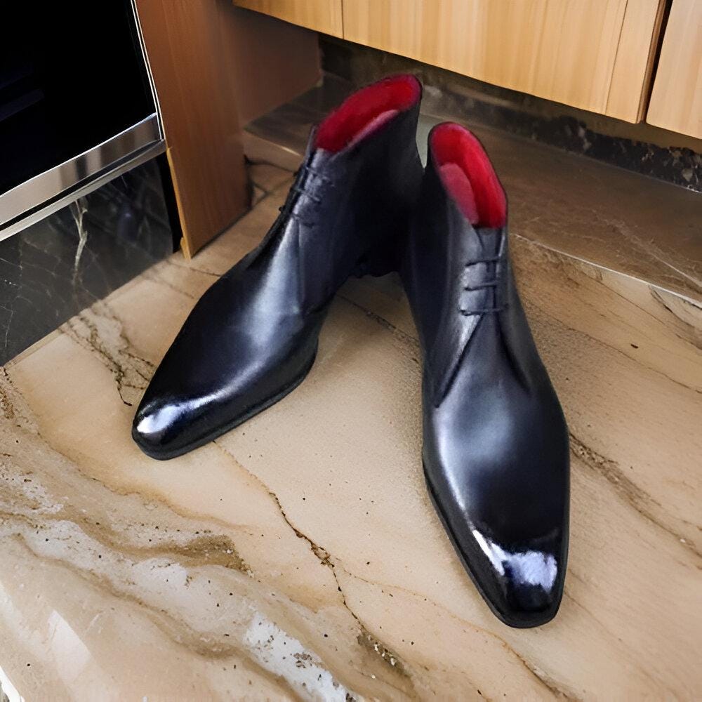 Men's Handmade Black Genuine Leather Boots, Men's Lace Up Derby Ank...